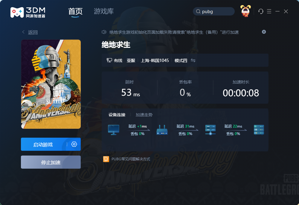 下载3DM加速器后,右上角输入pubg,选择“绝地求生”专区点击“立即加速”即可进行网络加速啦~